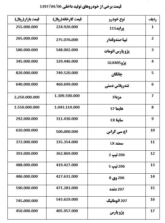 قیمت خودرو در بازار امروز به شرح زیر است: