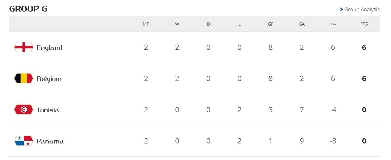 اما داستان گروه G مسابقات با قطعی شدن صعود انگلیس و بلژیک متفاوت است. دو تیمی که در امتیاز، گلزده، گل خورده و تفاصل گل برابر هستند و تنها به دلیل کارت زرد کمتر انگلیسیها در صدر جدول قرار دارند. با توجه به اینکه دیدارهای این گروه آخرین مسابقات مرحله مقدماتی خواهد بود، این احتمال نیز وجود دارد که هر دو کشور با توجه به اطلاع از وضعیت حریفان خود برای رسیدن به صدر گروه یا قرار گرفتن در رتبه دوم در ورزشگاه "کالینینگراد" حاضر شوند.