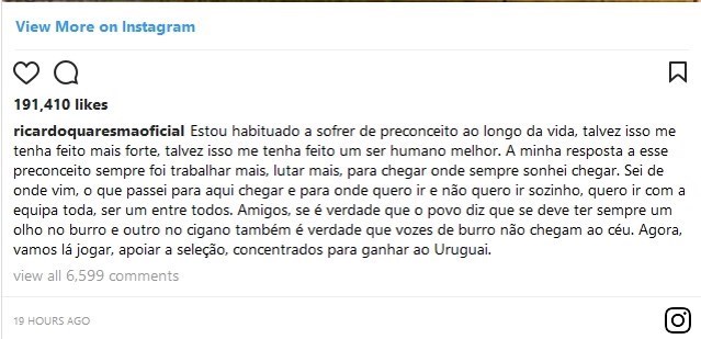 کوارشما در ادامه پیامش می‌نویسد: دوستان، اگر این درست است که مردم می‌گویند که باید یک چشمت به خر باشد و یک چشمت به کولی (ضرب‌المثلی پرتغالی به معنای اینکه باید حواست به اوضاع باشد) این هم درست که صدای خرها به آسمان نمی‌رسد (یک ضرب المثل پرتغالی دیگر با این معنا که حرف‌های احمقانه گوش کر می‌خواهد). حالا بگذارید بازی کنیم، حامی تیم ملی باشید و تمرکزمان روی کسب پیروزی مقابل اروگوئه باشد.