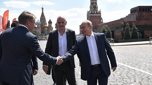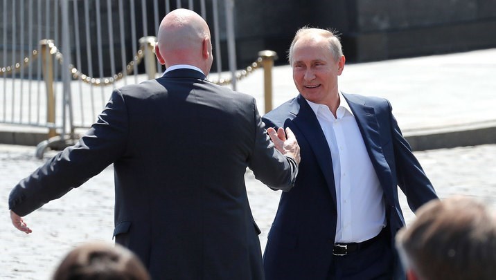 ولادیمیر پوتین، رئیس‌جمهور روسیه به طور مستقیم از کاخ کرملین با کت‌وشلوار و بدون کراوات به پارک فوتبال میدان سرخ مسکو با پای پیاده آمد. پیش از آغاز بازی تشریفاتی پوتین و اینفانتینو از این پارک فوتبال که جام جهانی نیز در آن به نمایش گذاشته شده است دیدن کردند. آنها سپس به سمت شبیه‌ساز فوتبال رفتند و تمرین بچه‌ها را تحت‌نظر گرفتند. پوتین و اینفانتینو همچنین پشت ضربه پنالتی به سمت دروازه‌بان ربات نیز ایستادند که ضربه‌های اول آنها ثمری نداشت. رئیس‌جمهوری روسیه ضربه دوم خود را تبدیل به گل کرد اما اینفانتینو باز هم ناکام ماند.