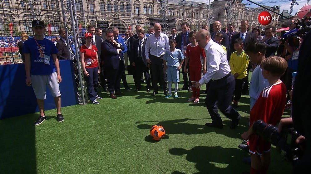 رئیس‌جمهور روسیه با پای پیاده از کاخ کرملین به پارک فوتبال مسکو رفت و با همراهی رئیس فیفا با بچه‌های تیم قهرمان یتیم‌خانه‌های جهان تحت هدایت ستاره‌های مشهور دنیای فوتبال بازی کردند.