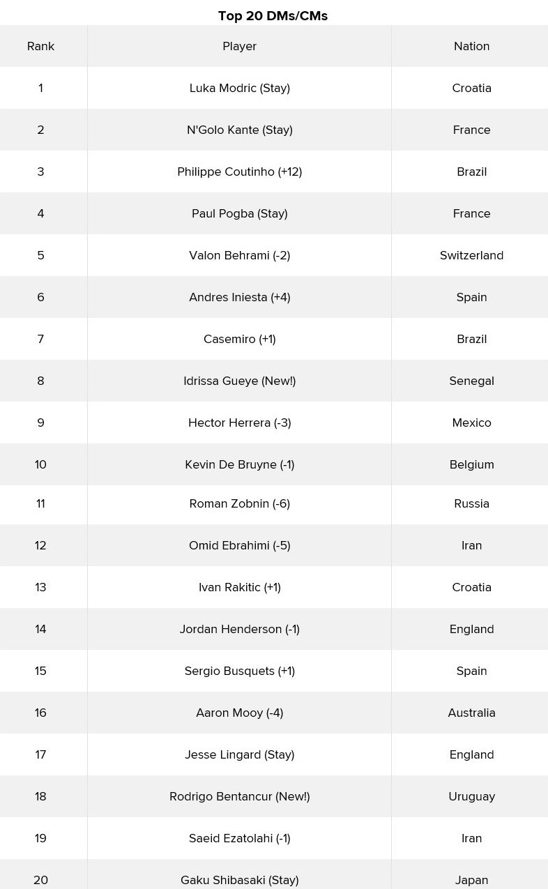 در ردهبندی «هافبکهای دفاعی و میانی» هم امید ابراهیمی با پنج پله سقوط و سعید عزتاللهی با یک پله سقوط به ترتیب در ردههای دوازدهم و نوزدهم این ردهبندی جای گرفتهاند.
