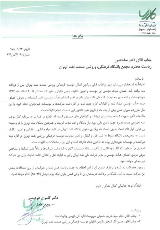 ناصر فریادشیران در گفتوگو با خبرنگار ورزشی خبرگزاری تسنیم درباره نامه رضا گلمحمدی، رئیس اداره کل ورزش و جوانان استان تهران به سید شریف حسینی، مدیرکل مجامع وزارت نفت اظهار داشت: گلمحمدی نامه خوبی را به آقای حسینی مدیرکل حسابرسی و امور مجامع نفت فرستاده که در آن نامه مقصر سقوط تیم نفت تهران به لیگ دسته اول و سایر اتفاقات را مجمع واگذاری نفت و شخص آقای کاردر (مدیرعامل شرکت ملی نفت) معرفی کرده است. این آقایان نه تیم را اداره و نه آن را به بخش خصوصی واگذار کردند.