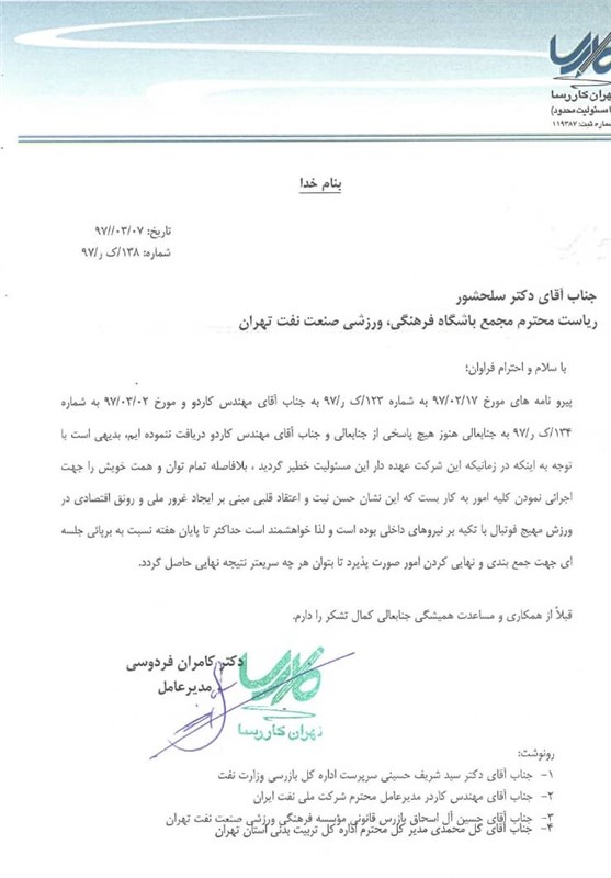 مربی تیم فوتبال نفت تهران تصریح کرد: این نامه در حال پیگیری است، اما این پیگیری منجر به این خواهد شد که انحلال کامل تیم نفت اعلام شود و تهران دیگر تیمی در لیگ دسته اول و تیمهای پایه نخواهد داشت. سه بازیکن به نامهای بیرانوند، امیری و پورعلیگنجی که در جام جهانی بازی کردند، حاصل تیم نفت بودند. اکنون همه تیمها خودشان را آماده حضور در مسابقات میکنند، اما تیم نفت نه مربی دارد، نه ساختاری و فقط یک اسم است.
