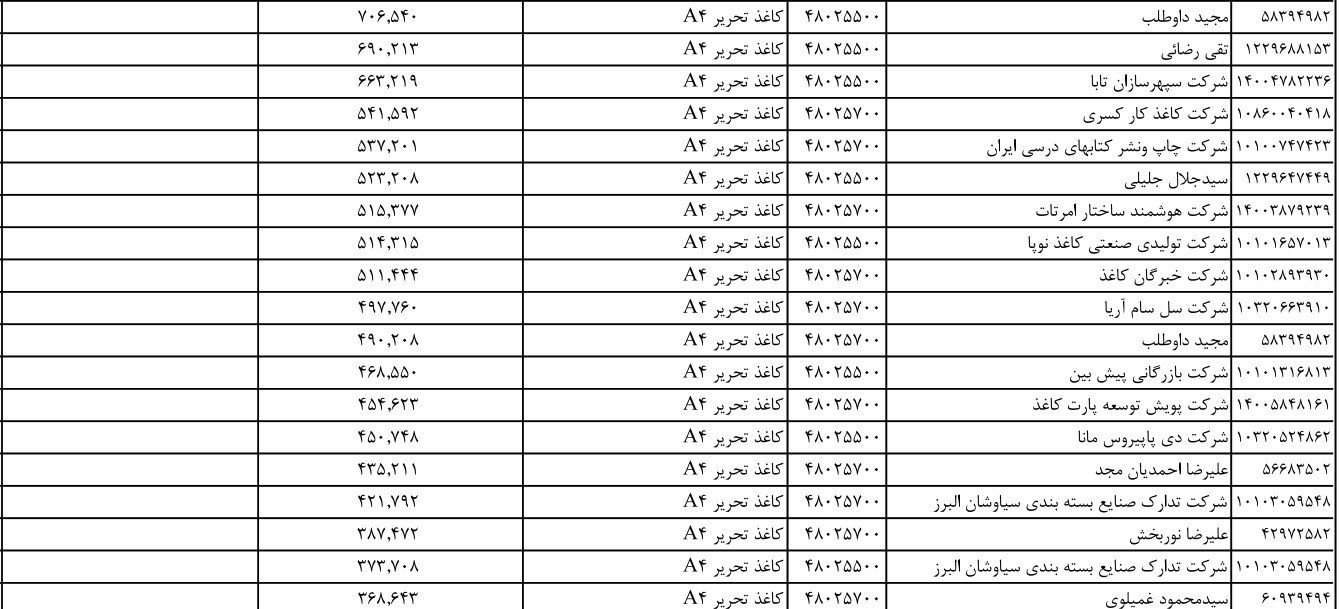 وی افزود: تعداد بازرگانان قدیمی و شناسنامهدار کاغذ چه آنهایی که عضو انجمن هستند و چه آنهایی که نیستند، در این فهرست بسیار محدود است، بهنظر میرسد نوعی حمایت وجود داشته که برخی شرکتهای غیرشناسنامهدار توانستهاند چنین ارقامی را بهصورت ارز دولتی دریافت کنند، چرا که در بسیاری از موارد گمرک و بازرگانی بهدلیل تسویه حساب نکردن حتی هزار دلار مانع اقدامات بعدی میشوند.