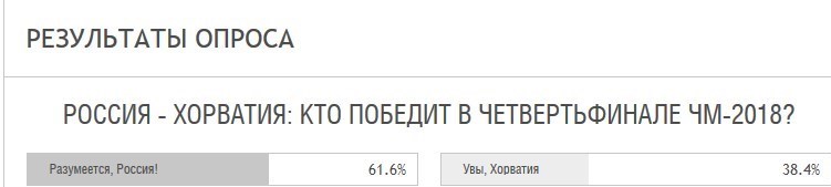 61.6 درصد شرکتکنندگان در نظرسنجی روزنامه اسپورت اکسپرس به پیروزی تیم ملی فوتبال روسیه در مصاف با کرواسی رای دادهاند. 38.4 درصد نیز صعود کرواسی به نیمهنهایی جام جهانی 2018 روسیه را پیشبینی کردند.