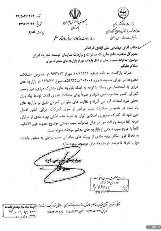 احتراما بازگشت به نامه شماره 60/69893 مورخ 97/3/13 در خصوص مشکلات مطروحه در اجرای مصوبه شماره 104002/ت54835هـ مورخ 96/8/22 در بازارچههای مرزی به استحضار میرساند با توجه به اینکه بازارچههای مشترک مرزی، مرز رسمی گمرکی کشور محسوب نمیشوند و صرفا برای مبادلات تجاری اندک توسط پیلهوران محلی مورد استفاده قرار میگیرند و نظارتهای مقرراتی گمرکی دقیق در بازارچههای یاد شده در خصوص صادرات سیب درختی از سوی گمرکات اجرایی کشور اعمال نمیشود لذا گمرک جمهوری اسلامی ایران به شریط عدم امکان بهرهمندی از مزایای تعرفه(5) درصد واردات موز در قبال صادرات سیب درختی موضوع مصوبه فوقالاشاره، گاها به خروج سیب درختی از بازارچههای مذکورمواقت نموده است.
