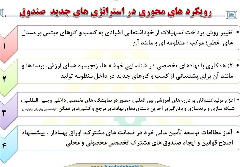 وی با اشاره به  استراتژی های عملیاتی شده در صندوق کارآفرینی اظهار داشت:استراتژی نخست: حمایت از تولید بازار محور مبتنی بر دو راهبرد است.