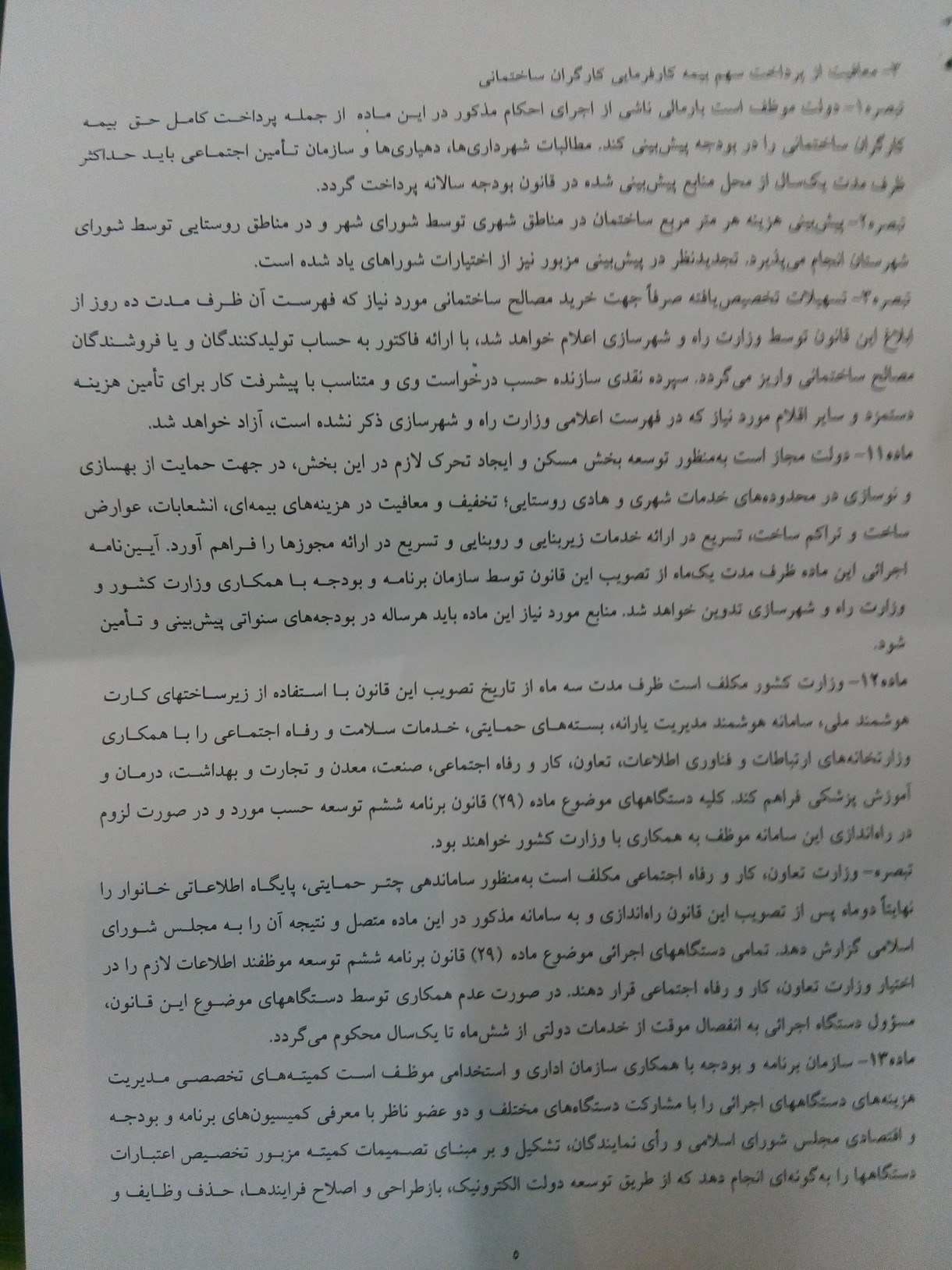 ماده 11: دولت مجاز است به منظور توسعه بخش مسکن و ایجاد تحرک لازم در این بخش در جهت حمایت از بهسازی و نوسازی در محدودههای خدمات شهری و هادی روستایی، تخفیف و معافیت در هزینههای بیمهای، انشعابات و عوارض ساخت و تراکم ساخت، تسریع در ارائه خدمات زیربنایی و روبنایی و تسریع در ارائه مجوزها را فراهم کند، آیین نامه اجرایی این ماده ظرف مدت یک ماده از تصویب این قانون توسط سازمان برنامه و بودجه با همکاری وزارت کشور و راه شهرسازی تدوین خواهد شد.