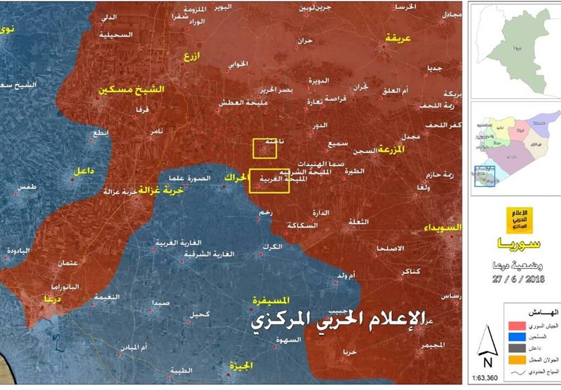 این در حالی است که منابع میدانی اعلام کردند، هدف از نبردهای کنونی ارتش سوریه رسیدن به گذرگاه مرزی نصیب است اما پیش از آن باید امنیت تمام مناطق اطراف آن تامین شود تا هیچ فرد مسلحی نتواند دستاوردی را که ارتش سوریه محقق ساخته و شامل تسلط بر بیش از 70 درصد از شهرک ها و روستاهای شرق و غرب درعا است، در معرض تهدید قرار دهد.