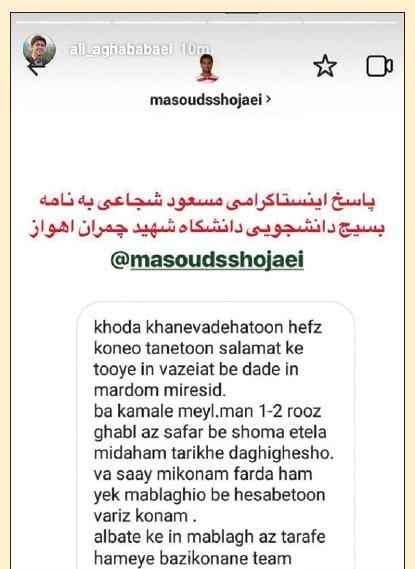 بسیج دانشجویی دانشگاه شهید چمران اهواز نامهای به شجاعی فرستاد که در آن آمده بود: «با توجه به ابراز دغدغهمندی شما نسبت به شرایط نامناسب آب مصرفی در شهرهای آبادان، خرمشهر و... و از طرفی اعزام مستمر گروه جهادی بسیج دانشجویی این دانشگاه به این مناطق جهت خدمترسانی و توزیع آب آشامیدنی، احتراما از جنابعالی دعوت به عمل میآید در جمع جهادگران و مردم محروم این مناطق حضور یابید.» نامهای که واکنش اینستاگرامی شجاعی را به همراه داشت و او در پست خود نوشت: «خدا خانوادههاتونرو حفظ کنه و تنتون سلامت که توی این وضعیت به داد این مردم میرسید. با کمال میل. من یکی دو روز قبل از سفر به شما اطلاع میدهم تاریخ دقیقش رو و سعی میکنم فردا هم یک مبلغیرو به حسابتون واریز کنم. البته این مبلغ از طرف همه بازیکنان تیم ملی هست و فقط از طرف من نیست. به امید دیدار بهزودی.» علاوهبر آن مسعود شجاعی روز گذشته پوستر گروه جهادی شهید چمران اهواز به منظور کمک به مردم خوزستان را در استوری خود قرار دارد؛ موضوعی که قطعا باعث کمک هر چه بیشتر به این خطه از کشورمان خواهد شد.