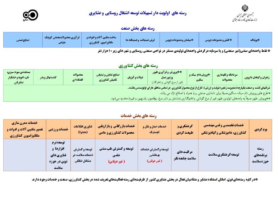 رسته های اولویت دار تسهیلات توسعه اشتغال روستایی و عشایری به شرح زیر است.