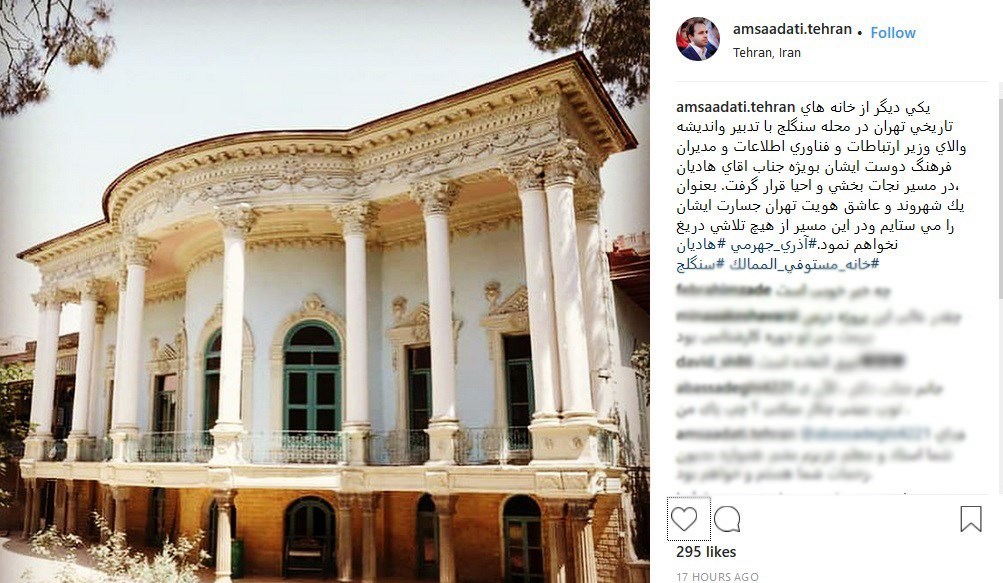 فارغ از این روایت، روز گذشته علی محمد سعادتی؛ مدیر بافت و بناهای تاریخی شهرداری تهران در اینستاگرامش نوشت: یکی دیگر از خانههای تاریخی تهران در محله سنگلج با تدبیر واندیشه والای وزیر ارتباطات و فناوری اطلاعات و مدیران فرهنگ دوست ایشان، در مسیر نجاتبخشی و احیا قرار گرفت.