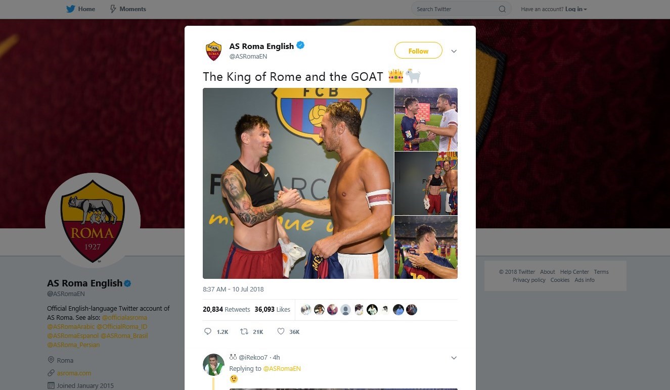 این باشگاه در صفحه تویئتر خود تصویری از صحنه خوش و بش اسطوره خود فرانچسکو توتی و ستاره بارسلونا لیونل مسی، در بازی دو سال پیش دو تیم گذاشته است و در شرح این عکس نوشته است: پادشاه رم و بزرگترین بازیکن تمام تاریخ.