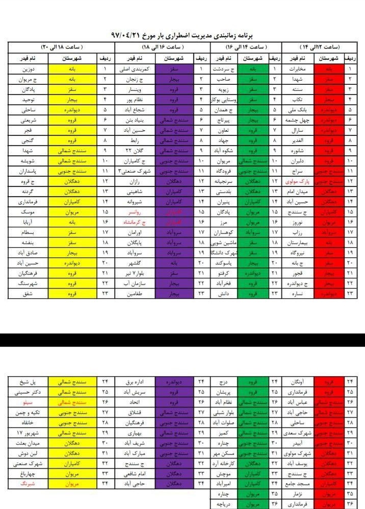 البته موضوع این گزارش به اینجا ختم نشد تا اینکه مجداداً امروز پنجشنبه (21 تیرماه) بدون اطلاعرسانی قبلی، برق شهروندان سنندجی قطع شد و باعرض پوزش، برنامه زمانبندی مدیریت اضطراری مندرج در سایت شرکت توزیع برق کردستان باز هم صوری بود که در ادامه مشاهده میکنید.