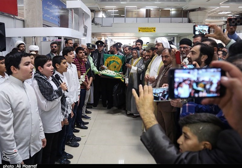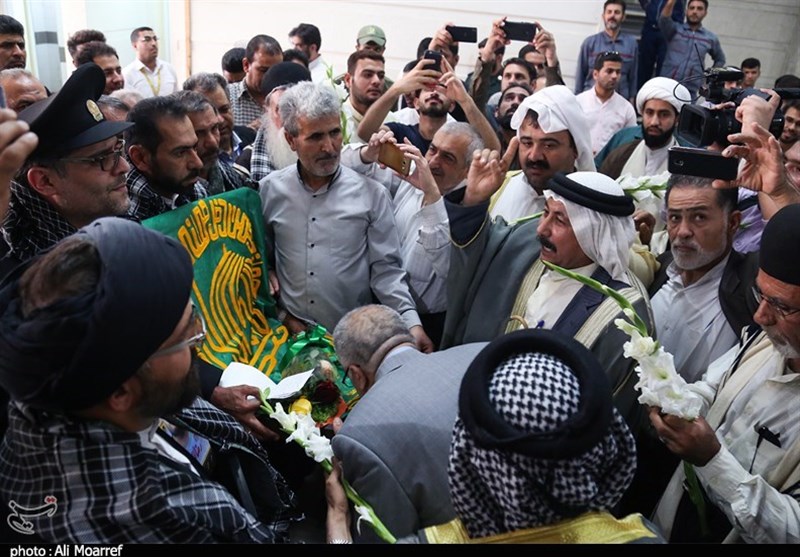 مراسم استقبال از خادمان حرم امام رضا(ع) با حضور مردم عشایر عرب، لر و خانواده‌های شهدا در فرودگاه اهواز برگزار شد.