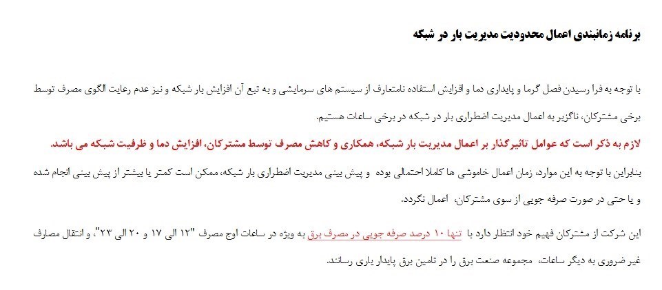 در این اطلاعیه، سه عامل "میزان مصرف"، "افزایش دما" و "ظرفیت شبکه" عوامل بروز قطعی های برق (مدیریت بار شبکه) اعلام شده اند.