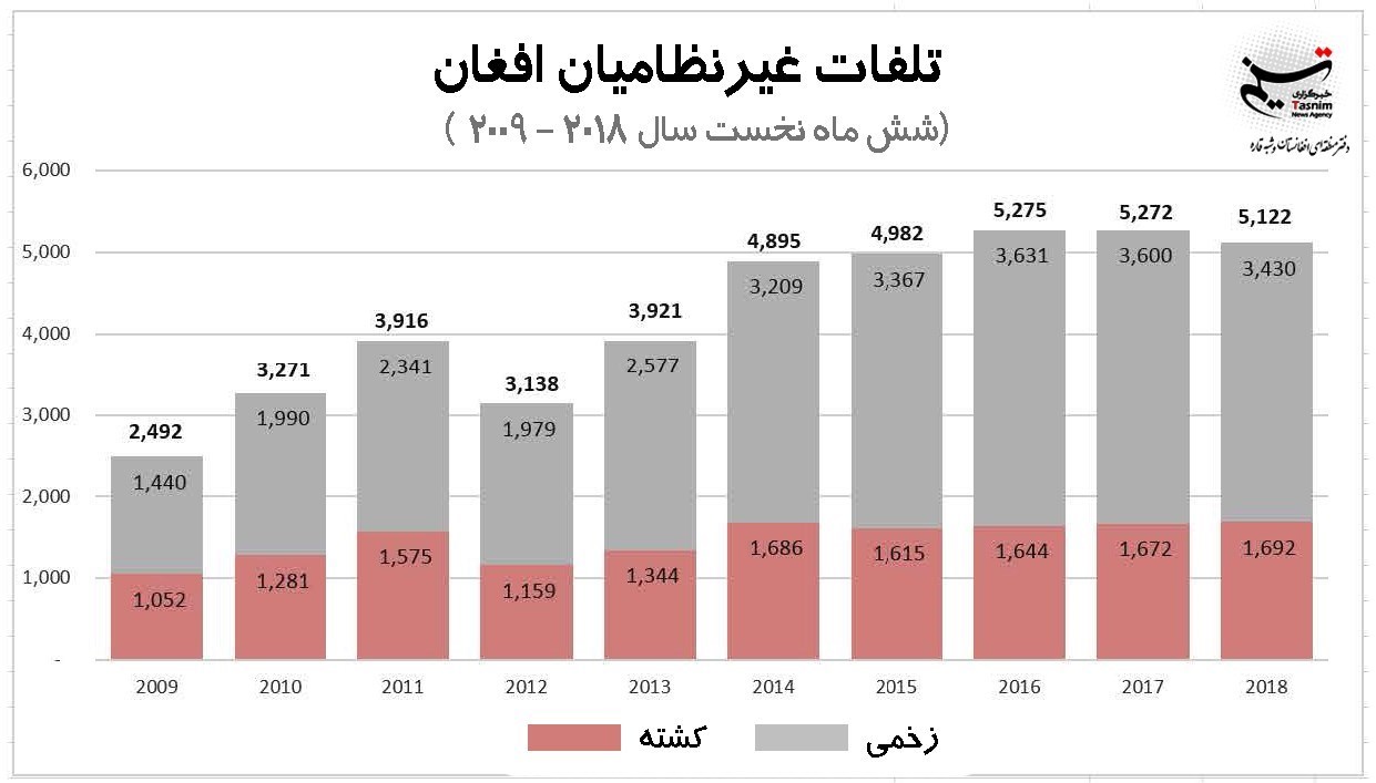یوناما مجموع تلفات غیرنظامیان افغان در شش ماه نخست سال جاری میلادی را 5 هزار و 112 نفر اعلام کرده است که از این میان هزار و 692 غیرنظامی افغان کشته و 3 هزار و 430 تن نیز زخمی شدند.