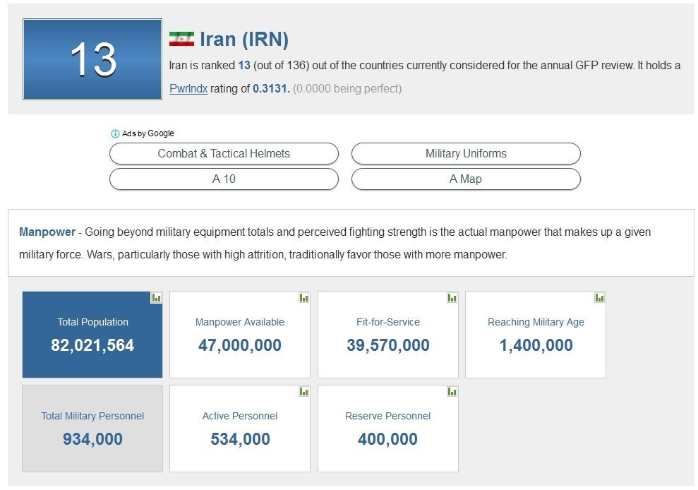 نه‌تنها برآوردهای داخلی، بلکه شاخصهای جهانی به‌روشنی حاکی از آن است که میزان جمعیت یک کشور بر حوزه‌های گوناگون اقتدار آن کشور تأثیرات عمیقی دارد. در حوزه نظامی برای سنجش قدرت نظامی یک کشور، مؤلفه‌های گوناگون جمعیتی سنجیده می‌شود. جمعیت کل[1]، نیروی در دسترس[2]، نیروی نظامی مناسب برای خدمت[3]، نیروی نظامی به سن خدمت رسیده[4]، نیروی نظامی فعال[5] و نیروی نظامی رزرو[6] برخی شاخص‌هایی هستند که برای سنجش آمادگی قوای نظامی هر کشور، مورد سنجش قرار می‌گیرند.