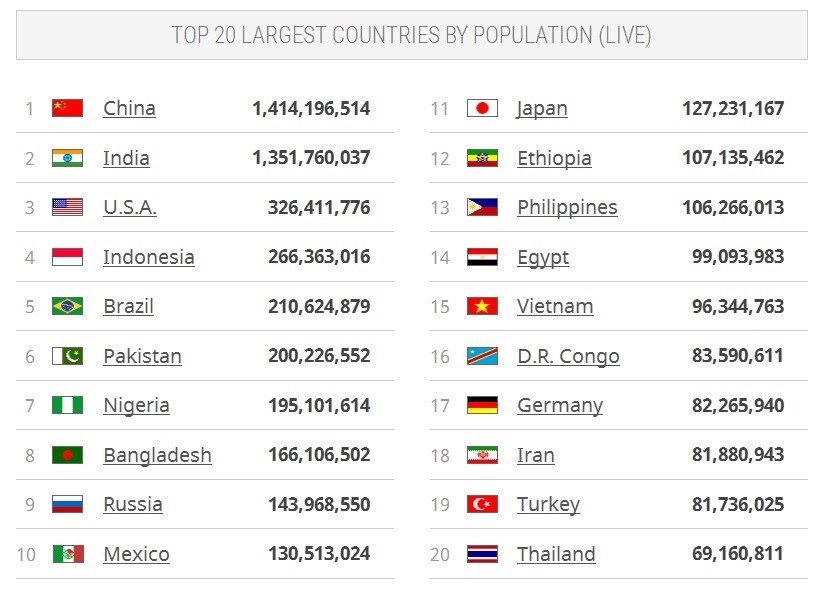 جمعیت جهان هم‌اکنون از 7.6 میلیارد نفر فراتر رفته است. نرخ افزایش سالانه جمعیت، 1.09 درصد است که با این حساب هر سال حدود 82 میلیون نفر به جمعیت جهان اضافه می‌شود. چین با بیش از 1.4 و هندوستان با 1.35 میلیارد نفر کشورهای اول و دوم پرجمعیت دنیا هستند و مجموعاً 36 درصد جمعیت جهان را در خود جای داده‌اند، پس از این دو، ایالات متحده با 326 میلیون نفر در جایگاه سوم قرار دارد. ایران با حدود 82 میلیون نفر، جایگاه هجدهم را به خود اختصاص داده است.