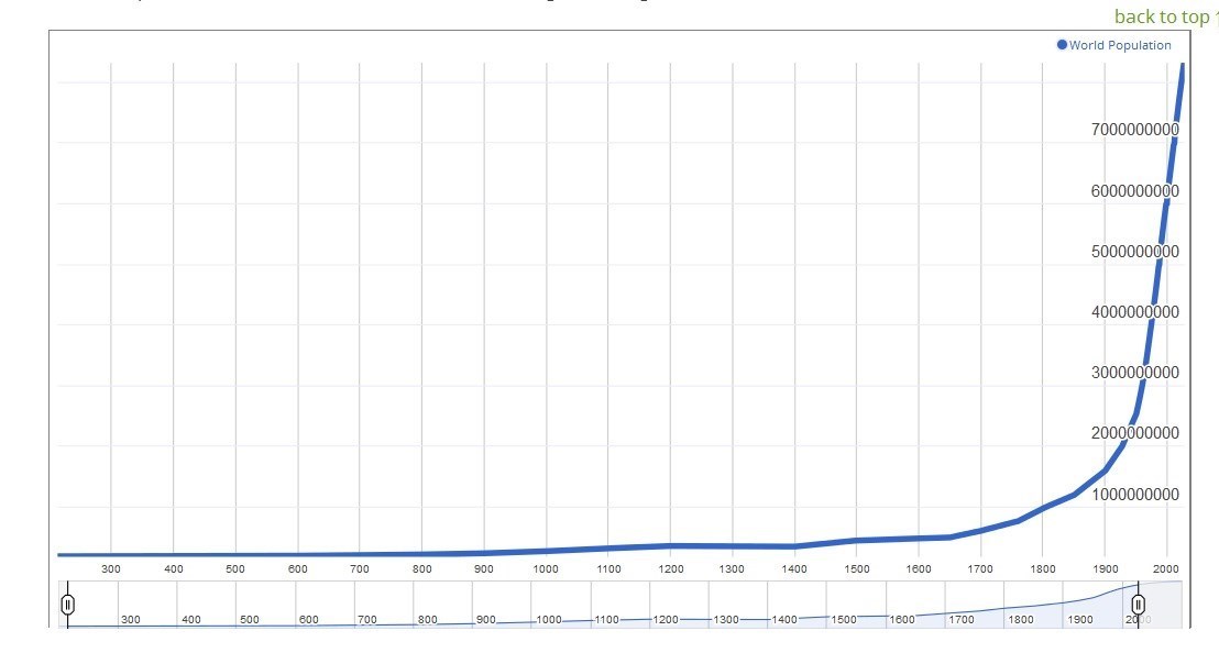 روند تغییرات جمعیت روی زمین در گذر تاریخ بسیار جالب توجه است. پیش از رخدادهایی مانند انقلاب جنسی[17] و همچنین برنامه‌های کاهش جمعیت در غرب، جمعیت جهان از ابتدای سده بیستم رشدی بی‌سابقه به خود گرفته بود. دلیل اصلی این رشد بی‌سابقه شاید همه‌گیری بهداشت و درمان بوده است؛ اکنون این روند افزایشی به‌دلیل سیاستهای فرهنگی و اجتماعی غرب بسیار کند شده است. بیایید نگاهی به روند افزایش جمعیت جهان از ابتدای میلاد مسیح تاکنون بیندازیم.