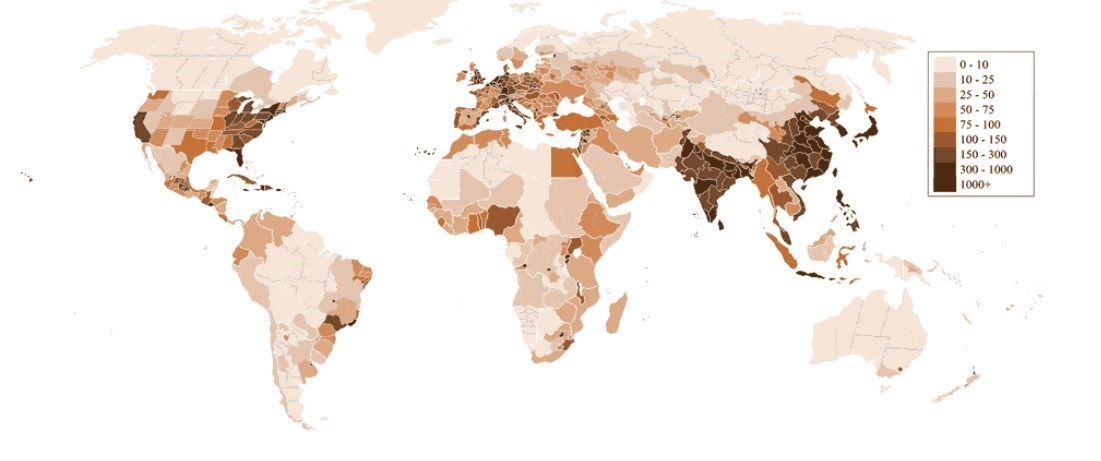 در این میان تراکم جمعیت نیز شایان توجه است. سرانه نفرات بازای زمین در دسترس، از 19 نفر به 51 نفر در هر کیلومتر مربع افزایش داشته است.[18] تراکم‌ سرزمینی جمعیت دنیا را در نقشه زیر مشاهده می‌کنید.
