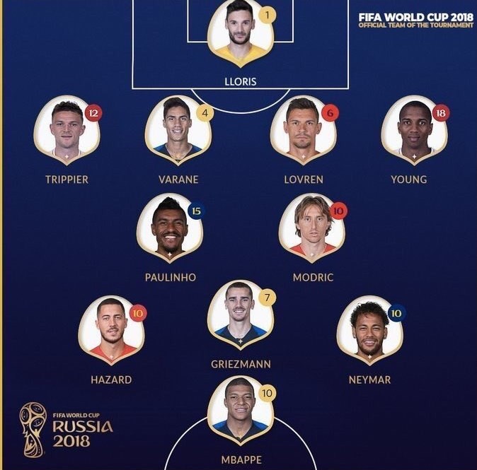 یوریس (فرانسه)، واران (فرانسه)، لوورن (کرواسی)، تریپیر (انگلیس)، اشلی یانگ (انگلیس)، مودریچ (کرواسی) پائولینیو (برزیل)، نیمار (برزیل)، گریزمان (فرانسه)، ازارد (بلژیک) و امباپه (فرانسه)