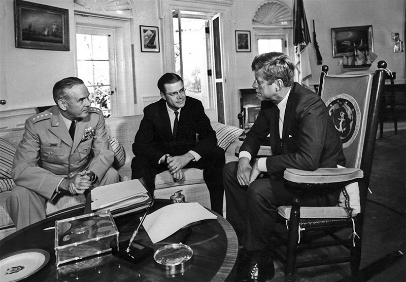 مک‌نامارا (وسط) در کنار جان‌اف‌کندی (راست)