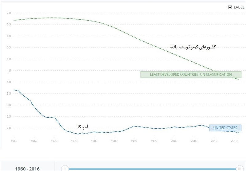 بانک جهانی: گراف مقایسه‌ای نرخ باروری در آمریکا و کشورهای کمتر توسعه یافته (در آمریکا این نرخ به نصف تقلیل یافت)6
