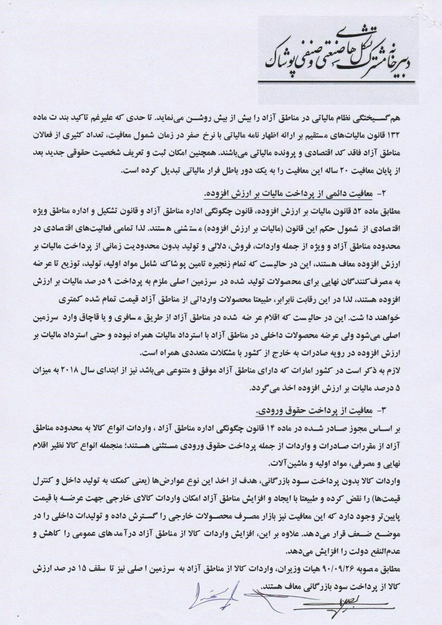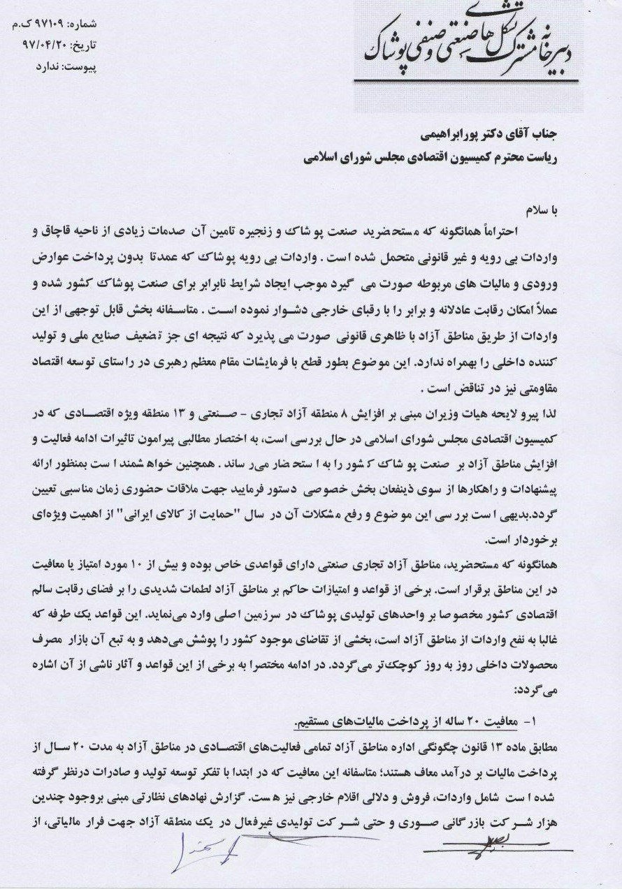 «... واردات بی رویه پوشاک که عمدتا بدون پرداخت عوارض ورودی و مالیات‌های مربوطه صورت می‌گیرد موجب ایجاد شرایط نابرابر برای صنعت پوشاک کشور شده و عملا رقابت عادلانه و برابر را با رقبای خارجی دشوار نموده است.متاسفانه بخش قابل توجهی از این واردات از طریق مناطق آزاد با ظاهری قانونی صورت می‌پذیرد...»