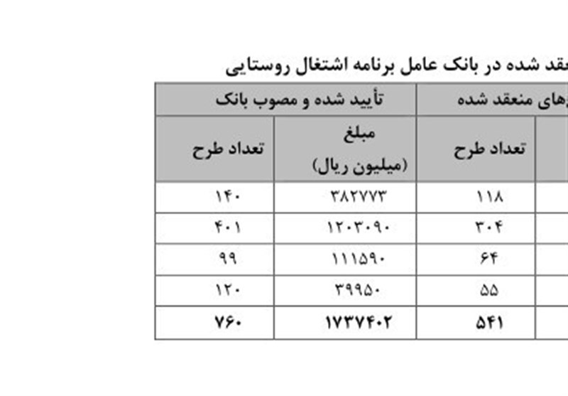 شواهد موجود نشان می دهد که به رغم گذشت8 ماه از ابلاغ آئین نامه، عملکرد مشخصی از اشتغالزایی یا حتی اعطای تسهیلات به این منظور دیده نمی شود. گزارش ارائه شده توسط وزارت تعاون، کار و رفاه اجتماعی نشان می دهد که تاکنون در اشتغال روستایی، 760طرح مصوب شده و نزدیک به 541 طرح تامین منابع شده اند که مبلغی در حدود 1337 میلیارد ریال به تامین اعتبار این طرح ها اختصاص یافته است.