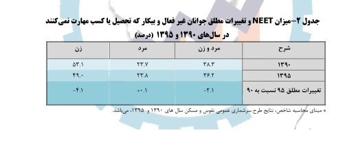 بررسی شاخص neet بر اساس نتایج طرح سرشماری عمومی نفوس و مسکن سال 95 و90 نشان دهنده روند نزولی میزان این شاخص می باشد به طوری که این میزان با کاهش 2.1 درصدی از 38.3 درصد در سال 90 به 36.2 درصد در سال 95، رسیده است این شاخص در گروه مردان با افزایش 0.1درصدی و در گروه زنان با کاهش 4.1 درصدی مواجه بوده است.