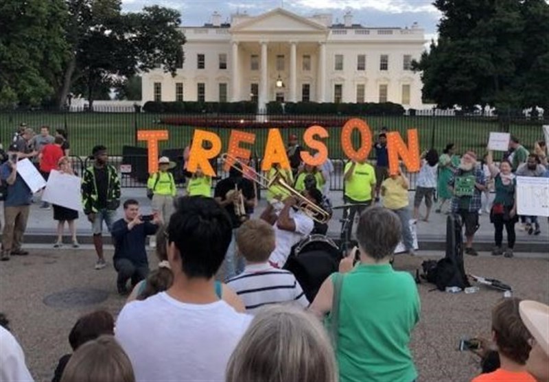 معترضان به ترامپ شب گذشته با جمع شدن در کنار نرده‌های محوطه کاخ سفید، پارچه‌نوشته‌ها و پلاکاردهایی با مضمون «خیانت» در دست گرفته و شعارهای اعتراضی سر دادند.