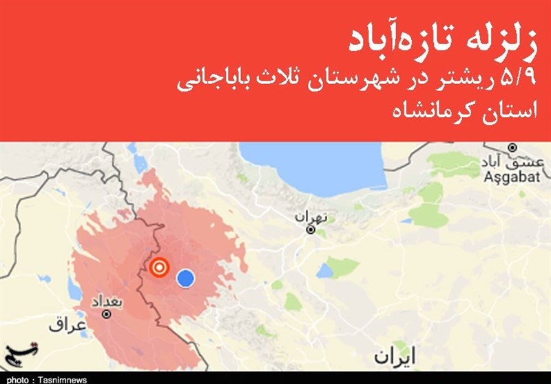 به گزارش خبرگزاری تسنیم از کرمانشاه، در ساعت 14 و 37 دقیقه زلزلهای به قدرت 5.9 ریشتر در عمق هشت کیلومتری زمین به مرکز شهر تازهآباد از توابع شهرستان ثلاث باباجانی در غرب استان کرمانشاه بهوقوع پیوست