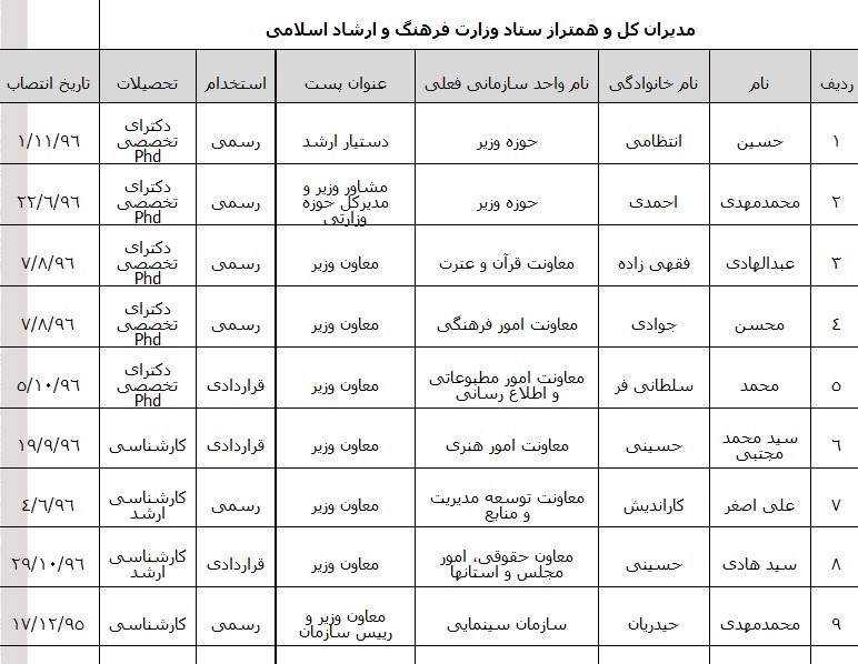 فهرست کامل وضعیت قراردادها و مدارک تحصیلی معاونان، مدیران و مشاوران وزارت ارشاد را میتوانید در اینجا ببینید.
