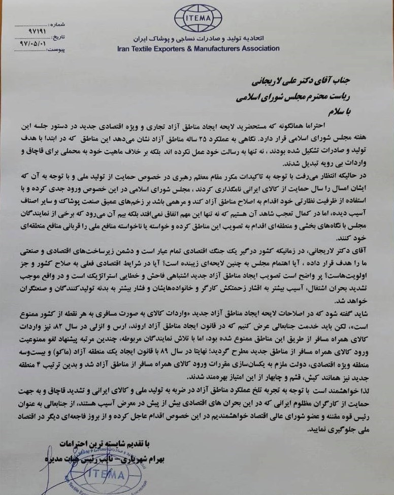 لذا خواهشمند است با توجه به تجربه تلخ عملکرد مناطق آزاد در ضربه به تولید ملی و کالای ایرانی و تشدید قاچاق و به جهت حمایت از کارگران مظلوم ایرانی که در این بحران های اقتصادی بیش از پیش در معرض آسیب هستند، از جنابعالی به عنوان رئیس قوه مقننه و عضو شورای عالی اقتصاد خواهشمندیم در این خصوص اقدام عاجل کرده و از بروز فاجعهای دیگر در اقتصاد ملی جلوگیری نمایید."
