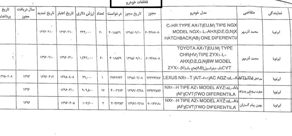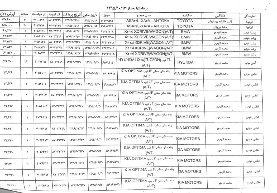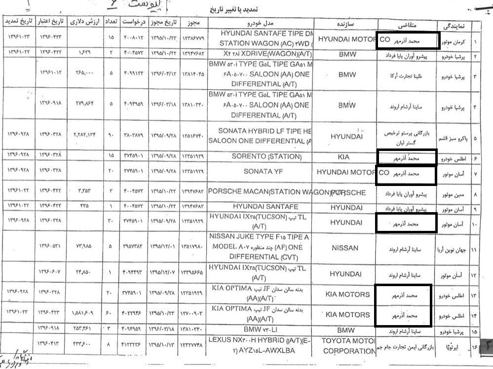 در لیست زیر فردی به نام محمد آذر مهر در فهرست تخلفات تمدید یا تغییر تاریخ حضور دارد. همچنین در ادامه نام این فرد و تعدادی دیگر از واردکنندگان در صفحات بعدی لیست وجود دارد.