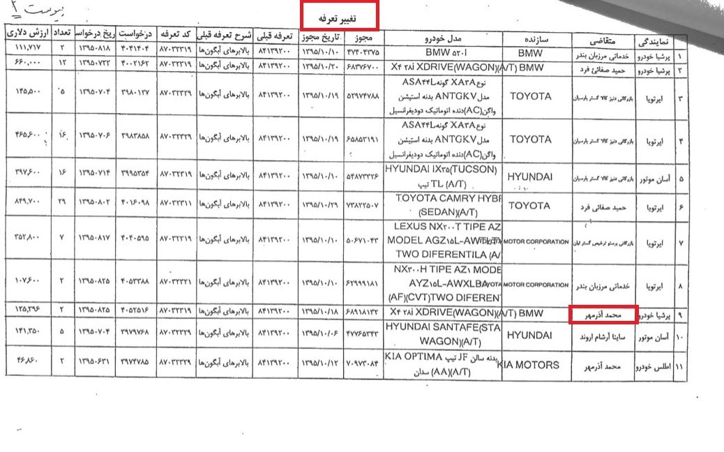 در لیست مربوط تغییر تعرفه نیز نام آذری مهر تکرار شده است.