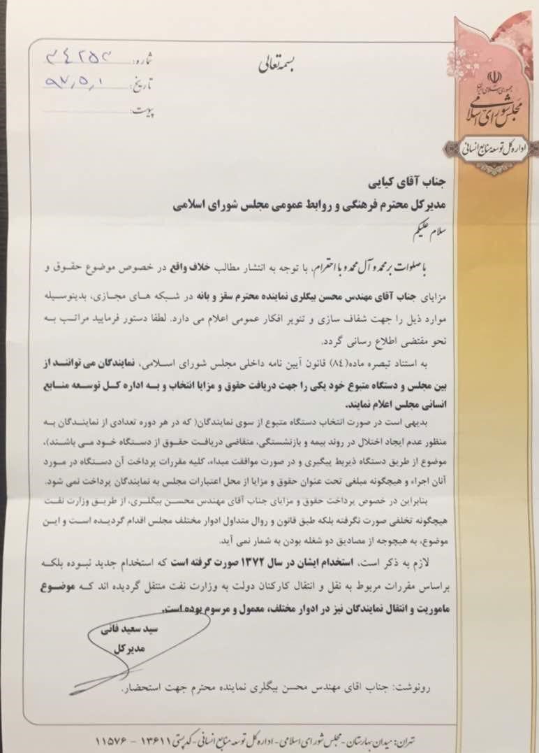 بنابراین در پایان متذکر میگردد؛ بیگلری هیچگونه حقوق و مزایایی از مجلس شورای اسلامی دریافت نمیکند و موضوع دوشغله بودن وی نیز براساس مستندات قانونی تکذیب میگردد.