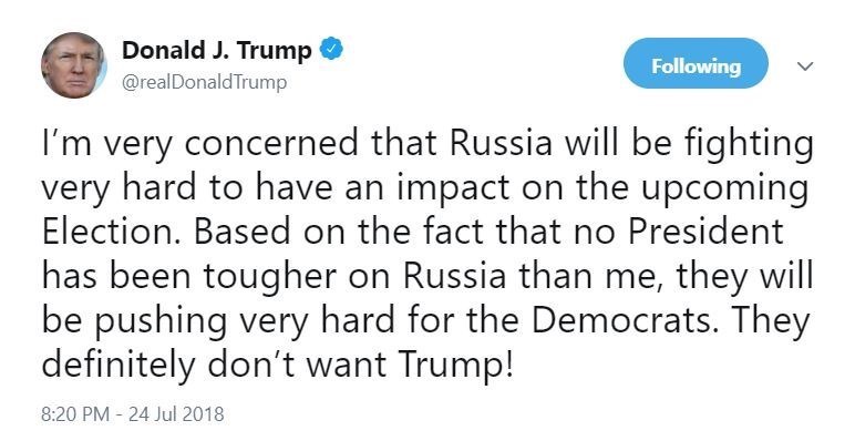 دونالد ترامپ در پیام توئیتری خود همچنین از تلاش سخت روسها برای تأثیرگذاری بر نتایج انتخابات آتی به شدت ابراز نگرانی کرد.