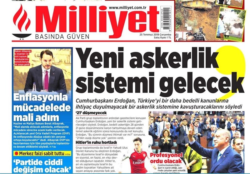 همچنین اظهارات اردوغان در مورد سیاستهای رژیم صهیونیستی اسرائیل و نیز تغییر قانون سربازگیری ترکیه، از نقاطی بود که به طور مشترک مورد توجه اغلب روزنامهها قرار گرفت.