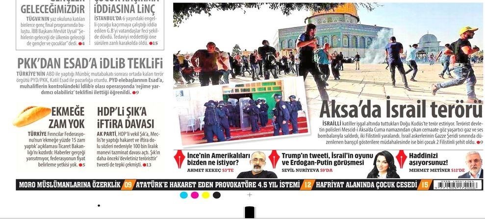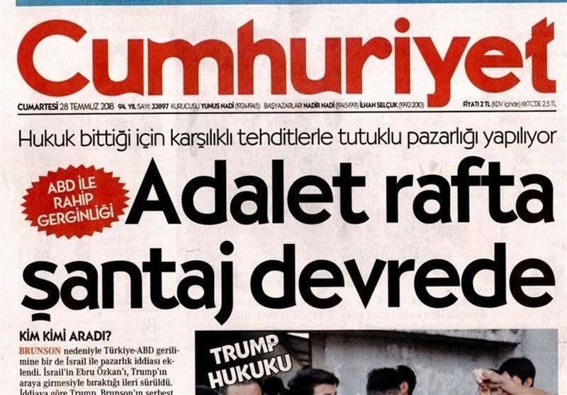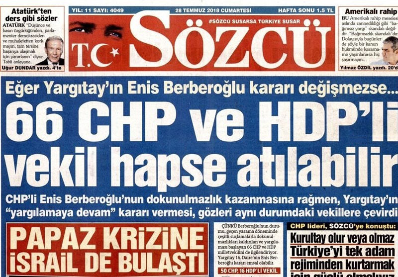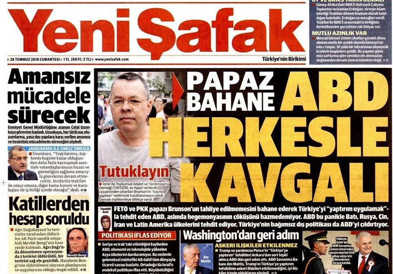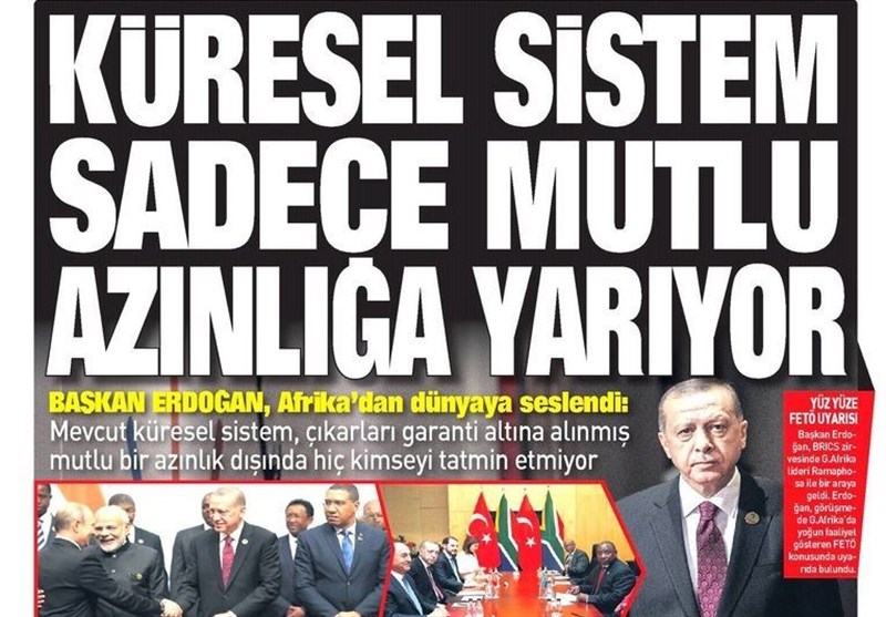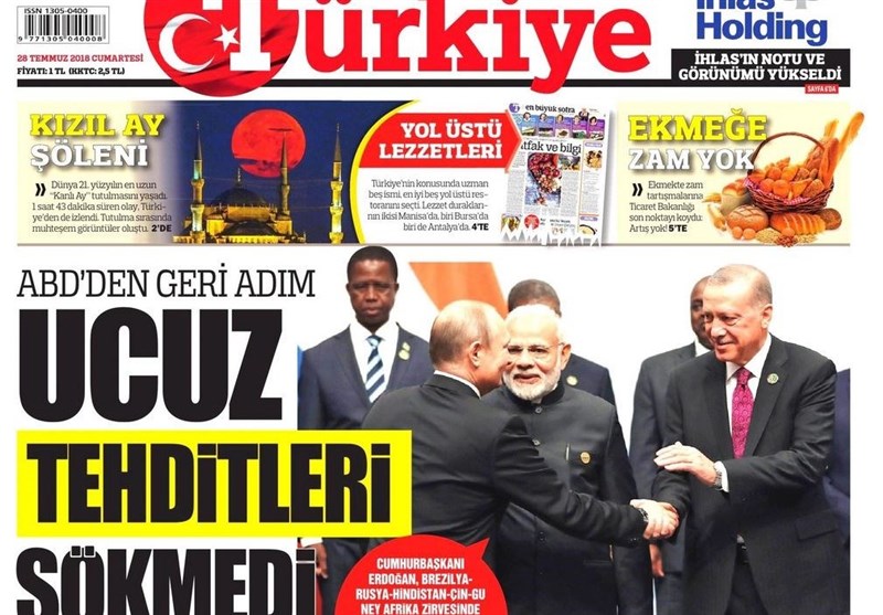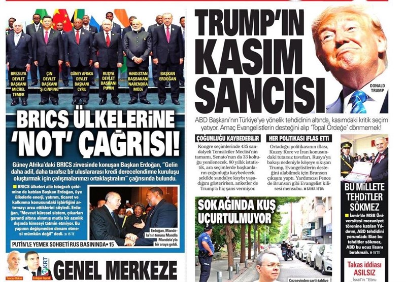 به گزارش گروه بینالملل خبرگزاری تسنیم، بسیاری از روزنامههای ترکیه، امروز در عکس و تیتر صفحه نخست، اظهارات رجب طیب اردوغان رئیس جمهور این کشور در نشست بریکس آفریقای جنوبی را برجسته کردهاند. همچنین این روزنامهها موضوعات دیگری مانند تهدیدات آمریکا علیه ترکیه در مورد کشیش زندانی، مذاکره کردهای سوریه و بشار اسد و اختلافات داخلی حزب جمهوری خلق را مورد توجه قرار دادهاند.