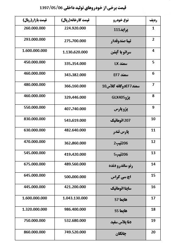 سمند ال ایکس هم با افزایش 1 میلیون تومانی با قیمت 45 میلیون تومان، پژو207 اتوماتیک با افزایش 1 میلیون تومانی با قیمت 83 میلیون تومان، پژو206 تیپ 2 با افزایش 3 میلیون تومانی با قیمت 47 میلیون تومان، دنا پلاس با افزایش 1 میلیون تومانی با قیمت 75 میلیون تومان و هایماS7 با افزایش 2 میلیون تومانی با قیمت 160 میلیون تومان مورد معامله قرار میگیرد.