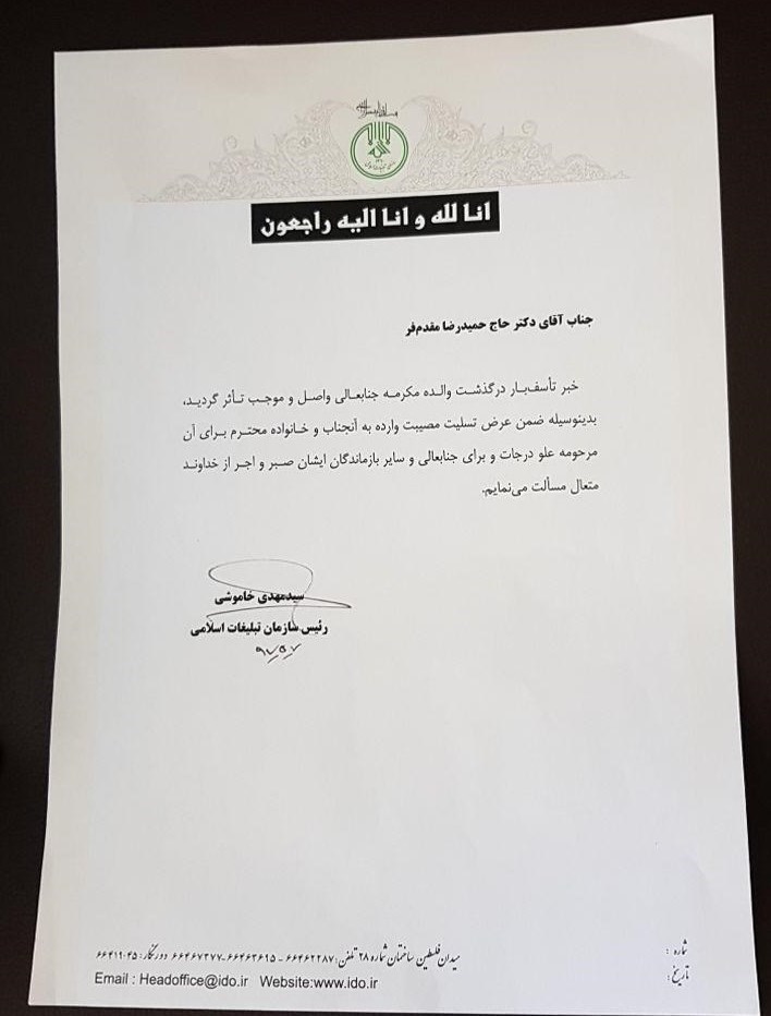 بدینوسیله ضمن عرض تسلیت مصیبت وارده به آن جناب و خانواده محترم برای آن مرحومه علو درجات، برای جنابعالی و سایر بازماندگان ایشان صبر و اجر از خداوند متعال مسئلت مینمایم.
