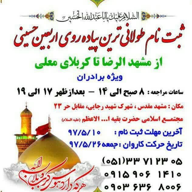 ثبتنام در این کاروان فقط مخصوص برادران است و دوستداران زیارت امام حسین (ع) میتوانند جهت ثبتنام از ساعت 8 الی 14 و 17 الی 20 به صورت حضوری به مجتمع اسلامی بقیةالله واقع در شهرک شهید رجایی مقابل حر 23 مراجعه کنند یا با شمارههای 05133712305 یا 09036368006 تماس بگیرند.