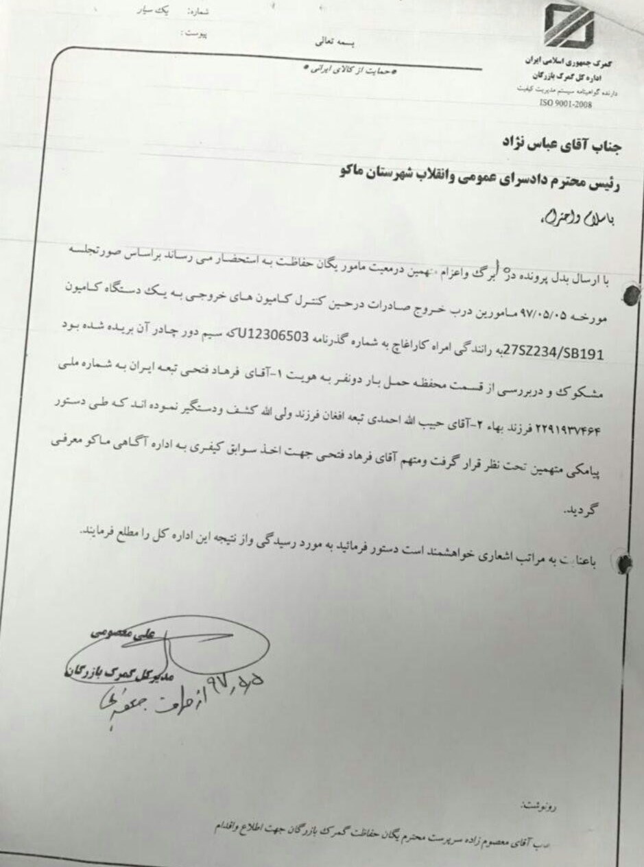 در نامه مدیرکل گمرک بازرگان به رئیس دادسرای عمومی و انقلاب شهرستان ماکو از دستگیری یک نفر تبعه ایرانی و یک نفر تبعه افغان فاقد مدارک به نام حبیب الله احمدی (مشکوک به شهرام جزایری ) از داخل کانتینر یک دستگاه تریلی خروجی ترک حامل بار عدس خبر داده شده است.