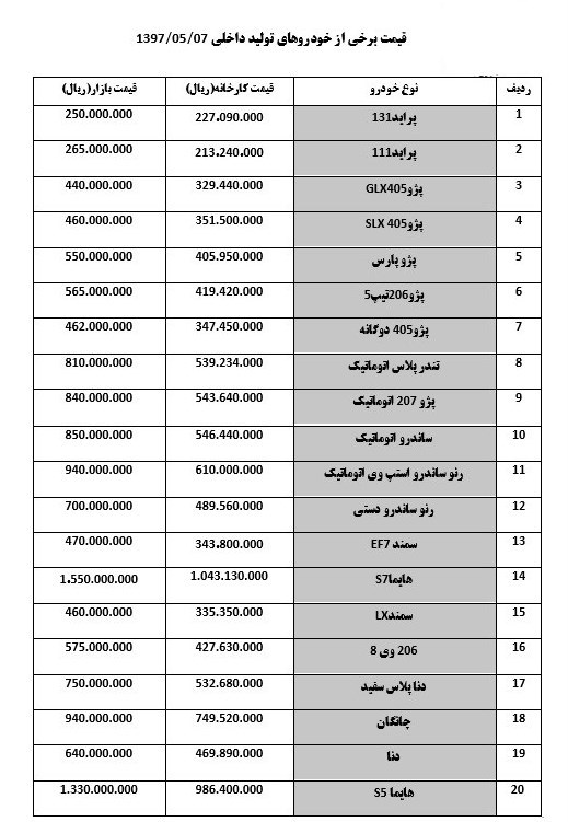 قیمت خودرو در بازار امروز بهشرح زیر است: