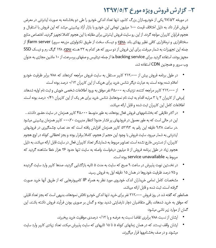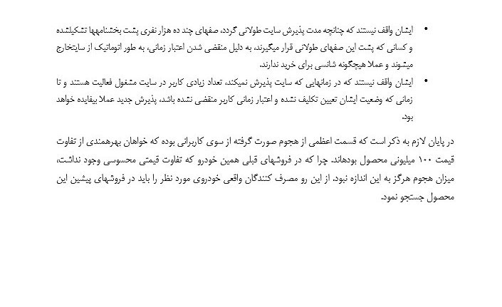 - ایشان واقف نیستند که چنانچه مدت پذیرش سایت طولانی گردد، صفهای چند دههزار نفری پشت بخشنامهها تشکیل شده و کسانی که پشت این صفهای طولانی قرار میگیرند، بهدلیل منقضی شدن اعتبار زمانی، بهطور اتوماتیک از سایت خارج میشوند و عملاً هیچگونه شانسی برای خرید ندارند.