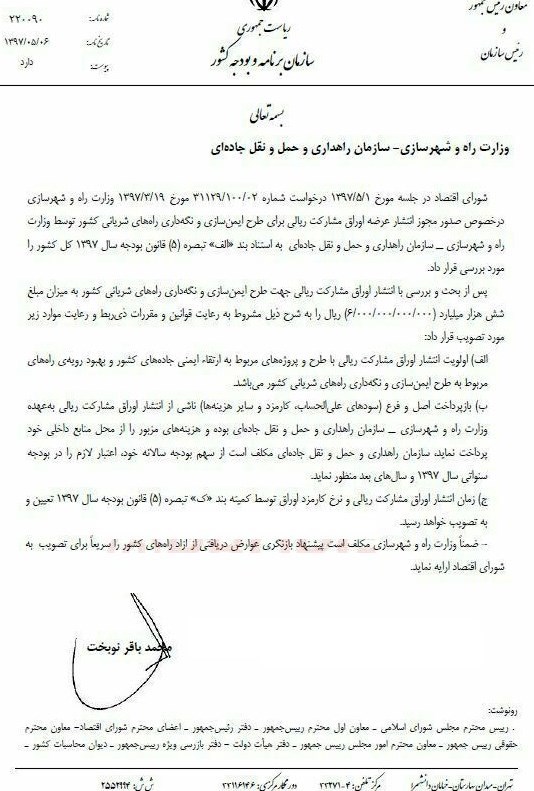 رئیس سازمان برنامه و بودجه، مجوز شورای اقتصاد درخصوص انتشار 6000 میلیارد ریال اوراق مشارکت برای طرح ایمن‌سازی و نگهداری راه‌های شریانی کشور توسط وزارت راه و شهرسازی را ابلاغ کرد.