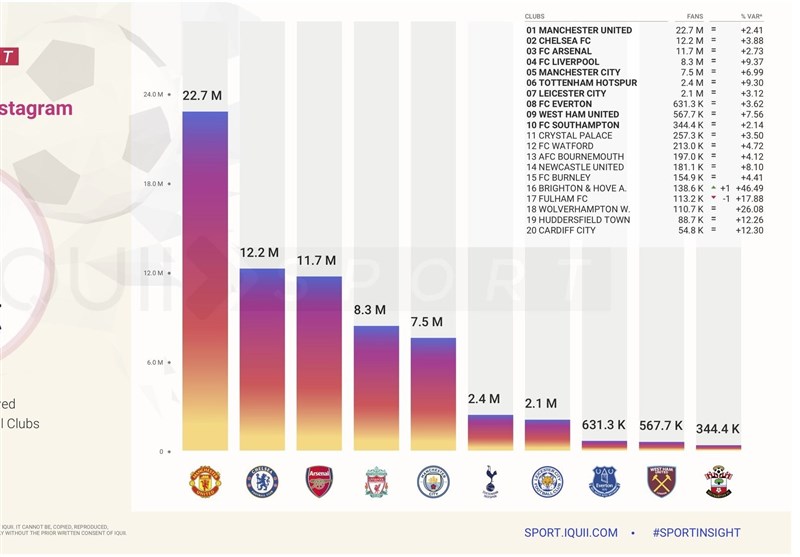 به طور کلی لیگ برتر انگلیس در اینستاگرام 70 میلیون دنبال کننده دارد و منچستریونایتد با 22.7 میلیون دنبالکننده بالاتر از چلسی، آرسنال و لیورپول در رتبه اول قرار گرفته است. باشگاه برایتون پس از جذب جهانبخش، یک پله از این نظر در جدول پرطرفدارترین باشگاههای لیگ جزیره صعود کرده و با تقریبا 139 هزار دنبال کننده، جایگاه شانزدهم را به خودش اختصاص داده است.